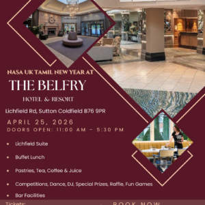 தமிழ் புத்தாண்டு கொண்டாட்டம் 2026 NaSa UK warmly invites you and your family to join ... 25 Apr 11:00 am - 5:30 pm The Belfry Hotel & Resort, Lichfield SuiteLichfield Road, Sutton Coldfield B76 9PR